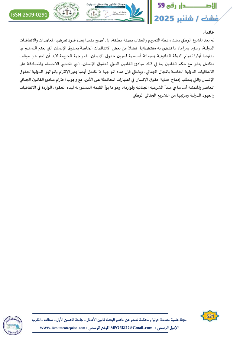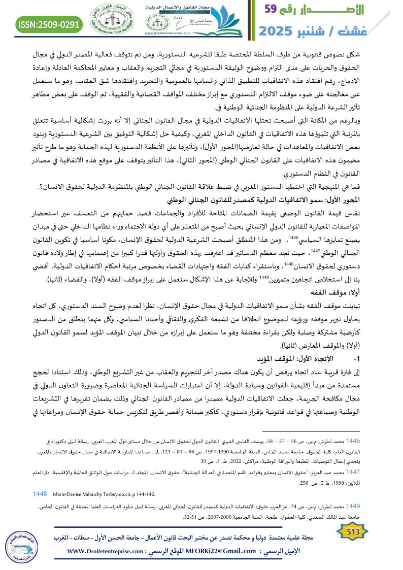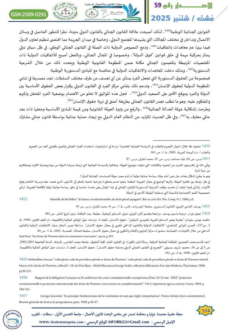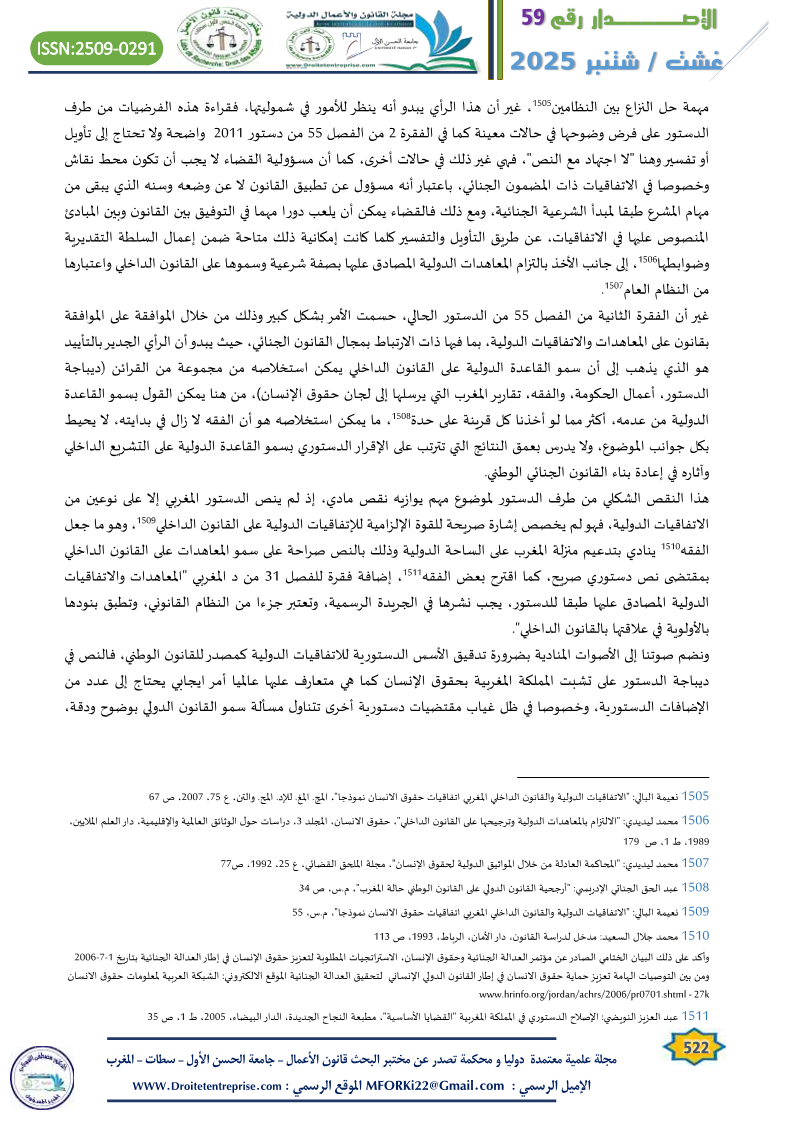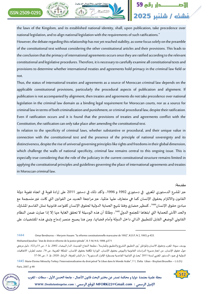 In relation to the specificity of criminal laws, whether substantive or procedural, and their unique value in connection with the constitutional text and the presence of the principle of national sovereignty and its distinctiveness, despite the rise of universal governing principles like rights and freedoms in their global dimension, which challenge the walls of national specificity, criminal law remains central to this ongoing issue. This is especially true considering that the role of the judiciary in the current constitutional structure remains limited in applying the constitutional principles and guidelines governing the place of international agreements and treaties in Moroccan criminal law.