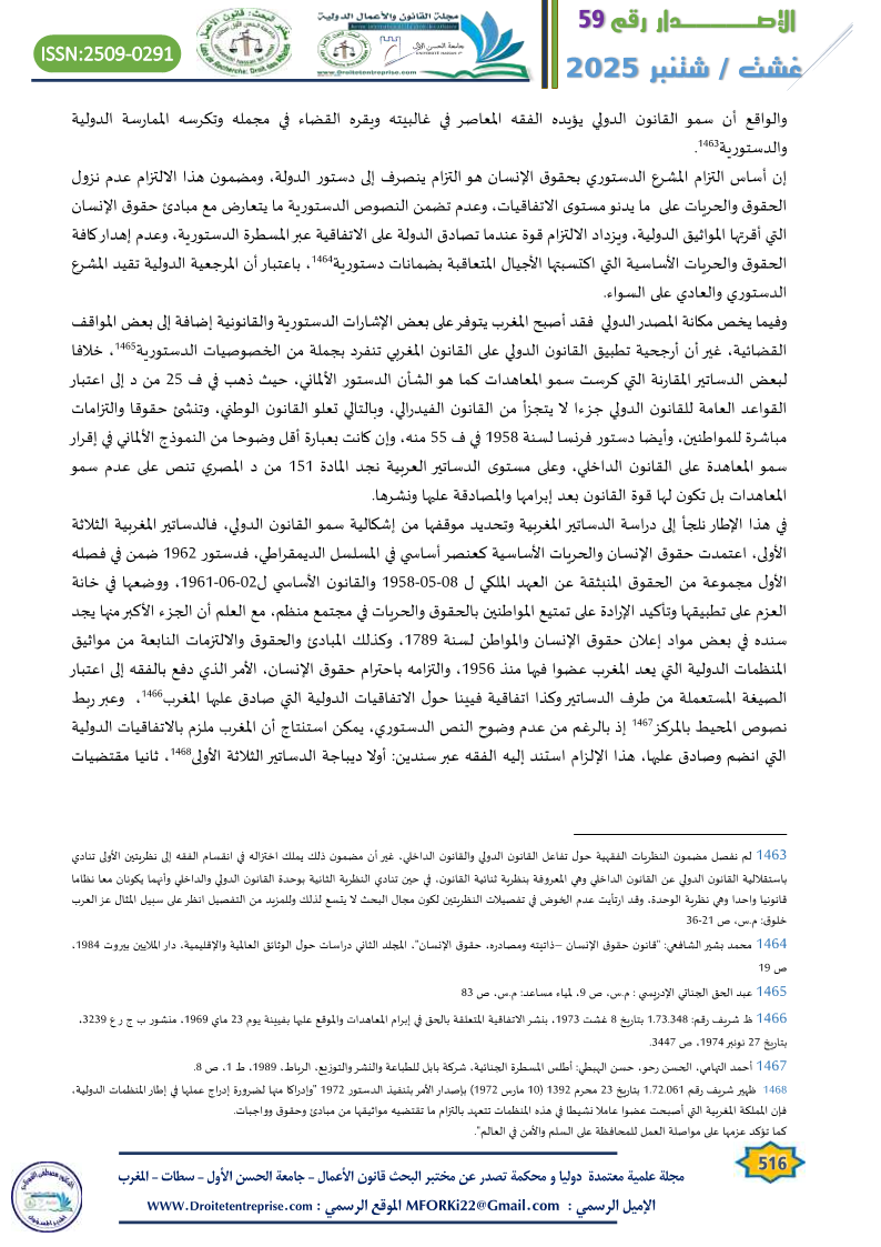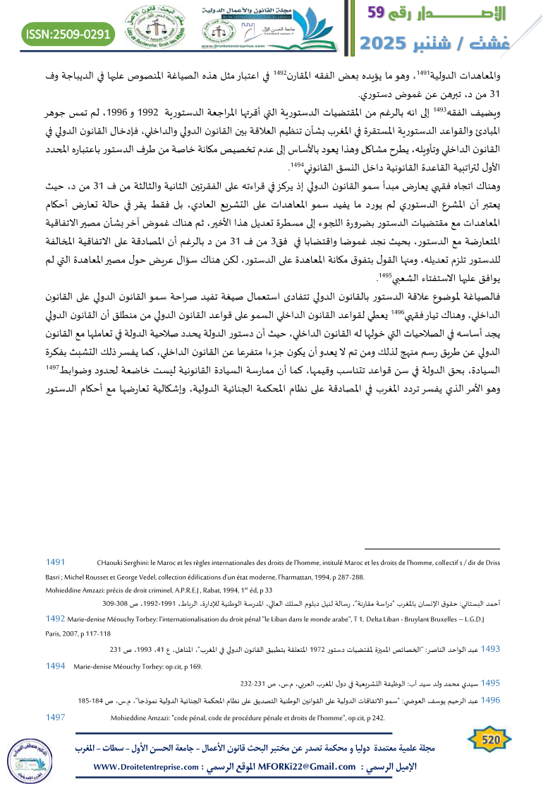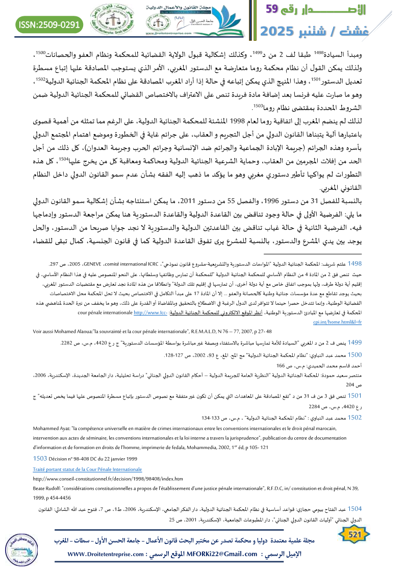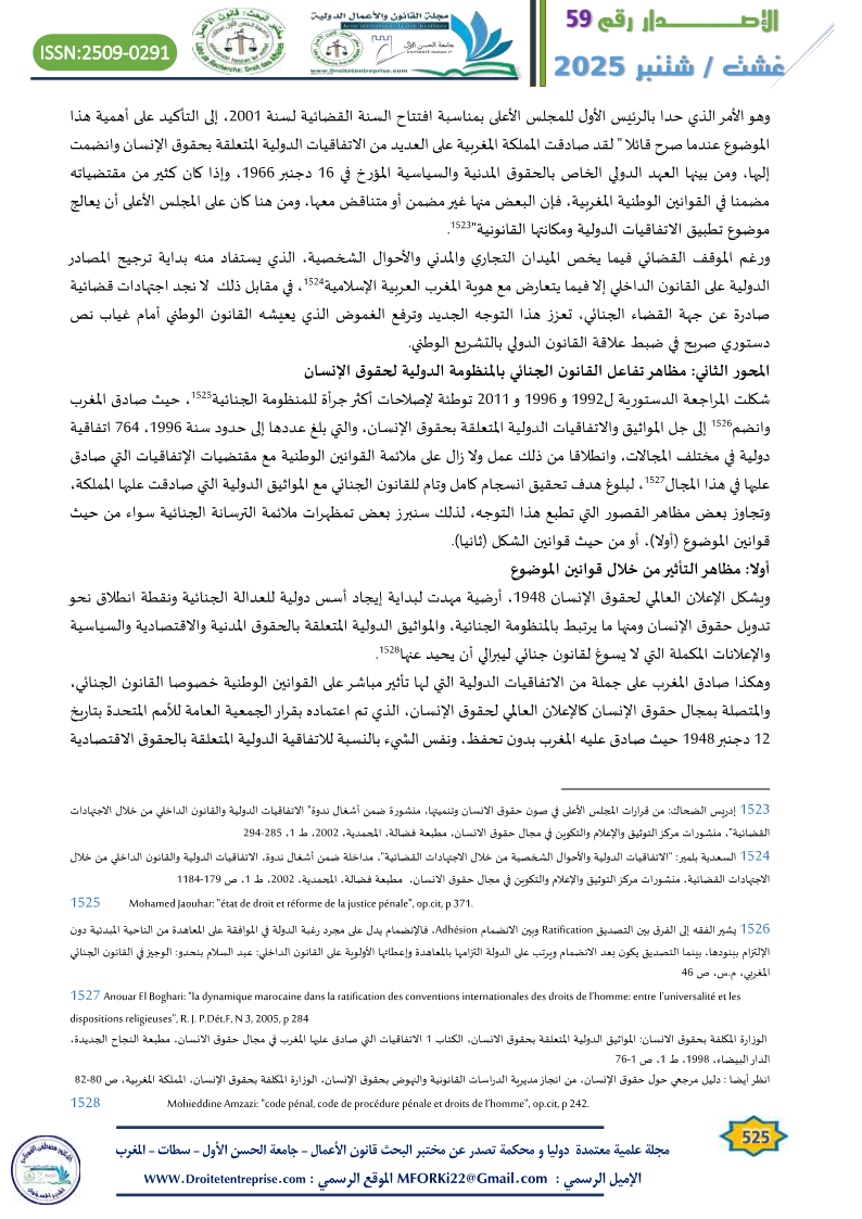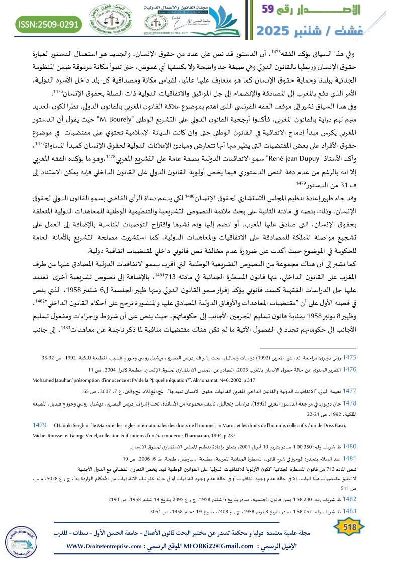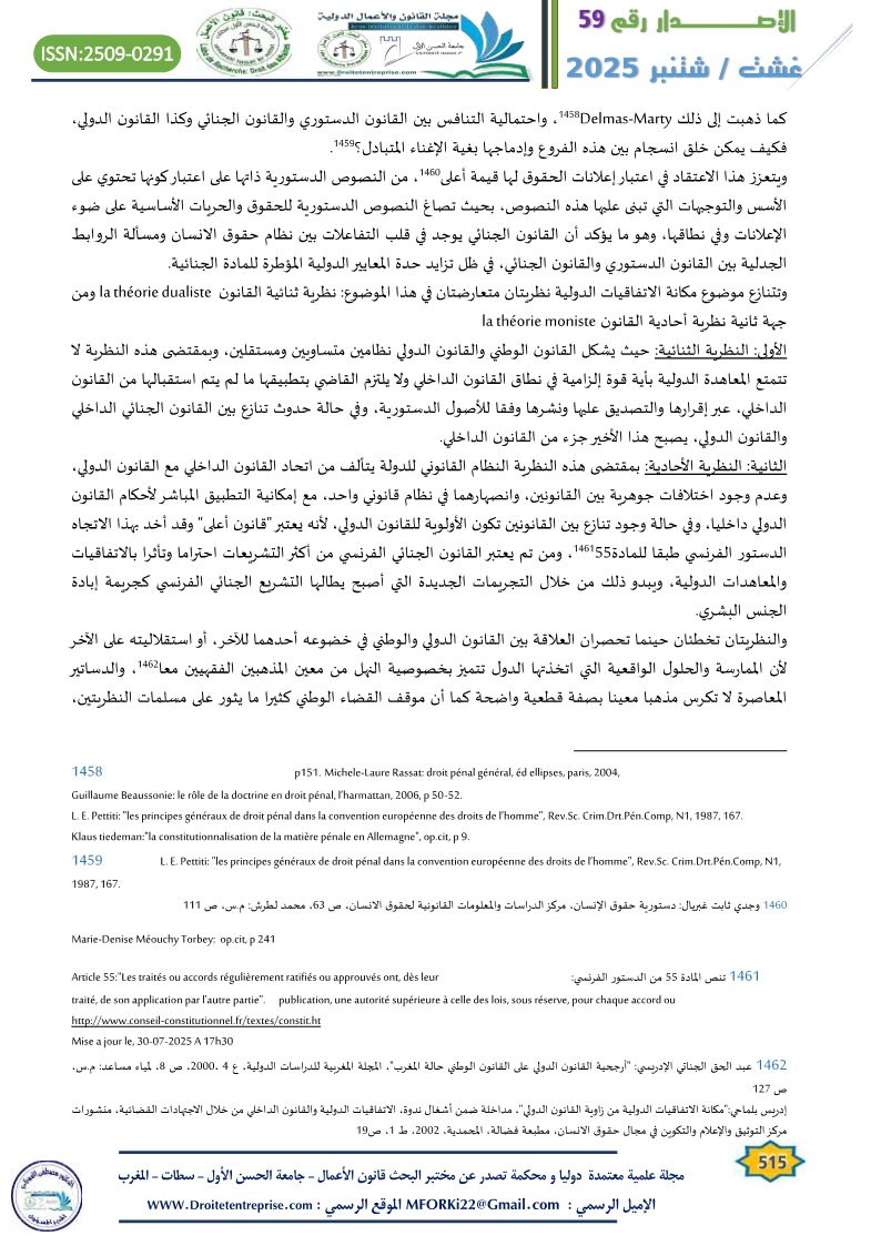 In relation to the specificity of criminal laws, whether substantive or procedural, and their unique value in connection with the constitutional text and the presence of the principle of national sovereignty and its distinctiveness, despite the rise of universal governing principles like rights and freedoms in their global dimension, which challenge the walls of national specificity, criminal law remains central to this ongoing issue. This is especially true considering that the role of the judiciary in the current constitutional structure remains limited in applying the constitutional principles and guidelines governing the place of international agreements and treaties in Moroccan criminal law.