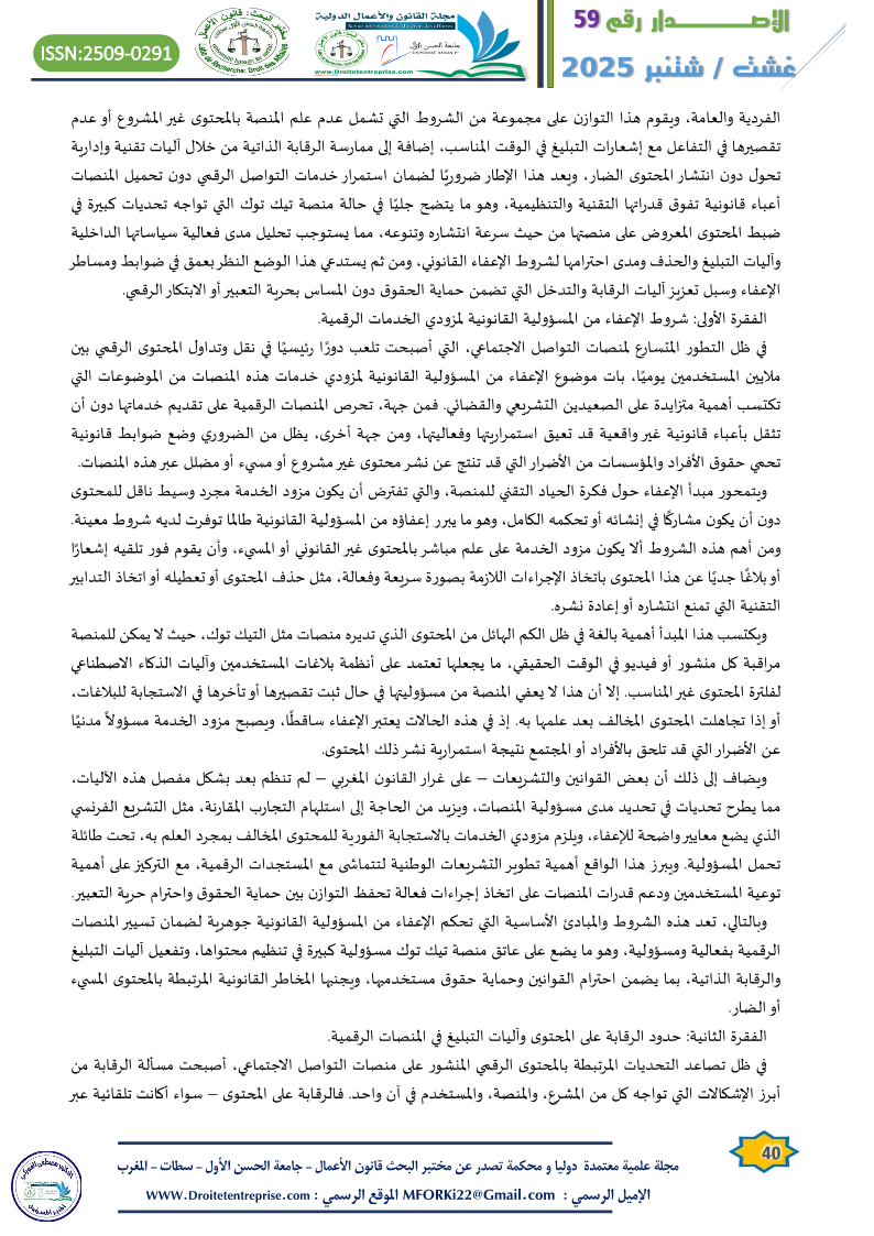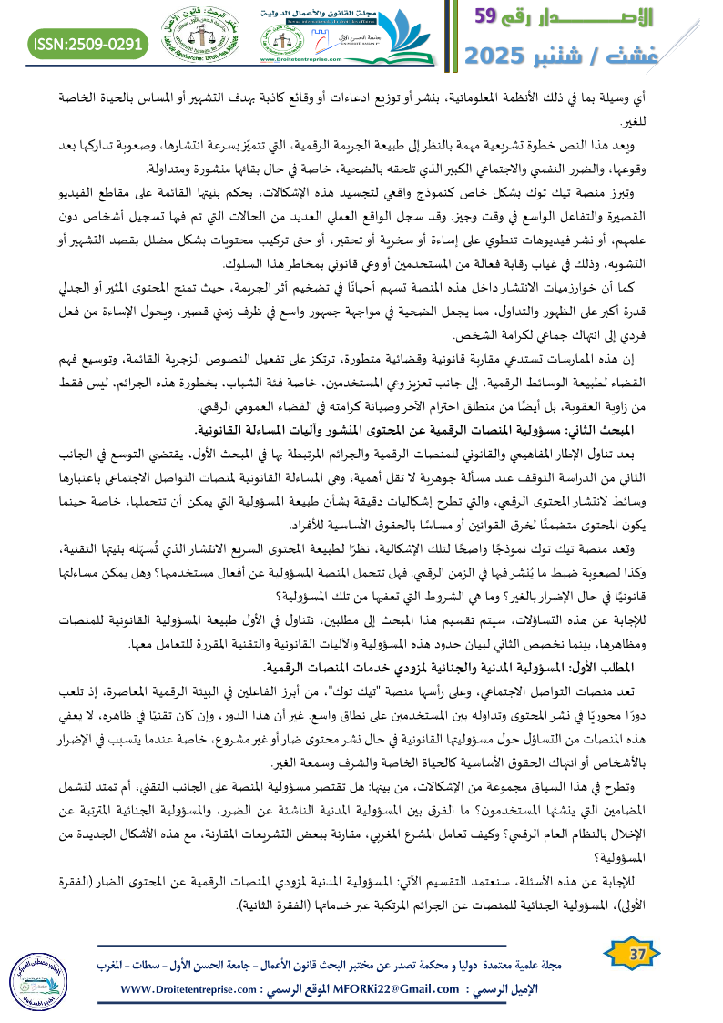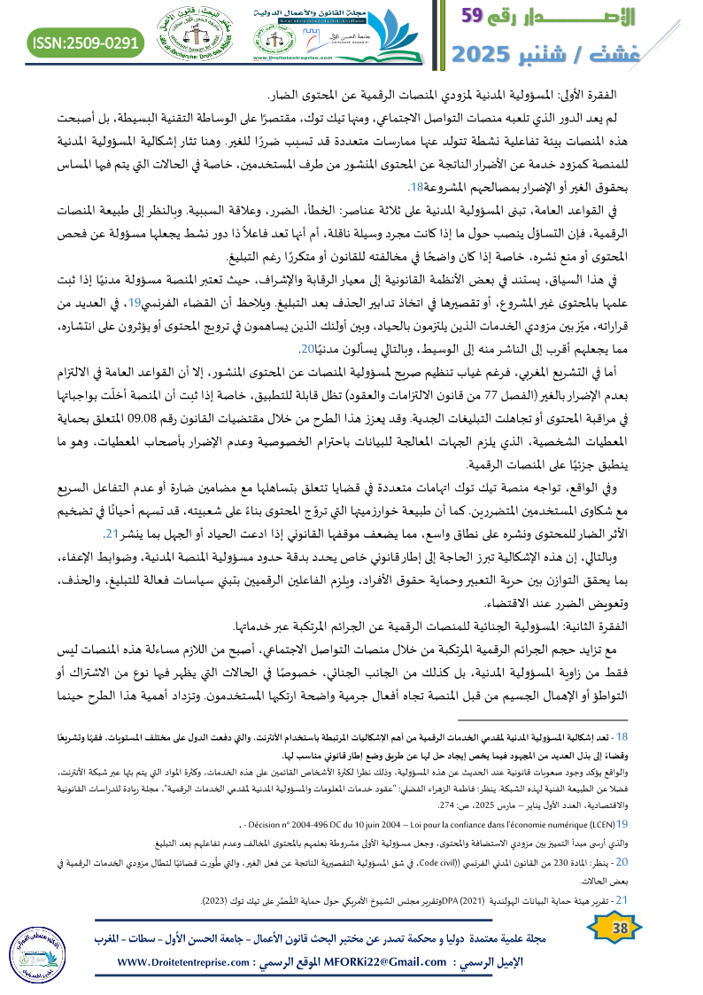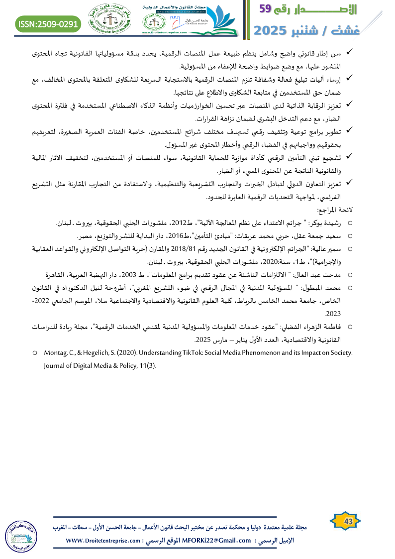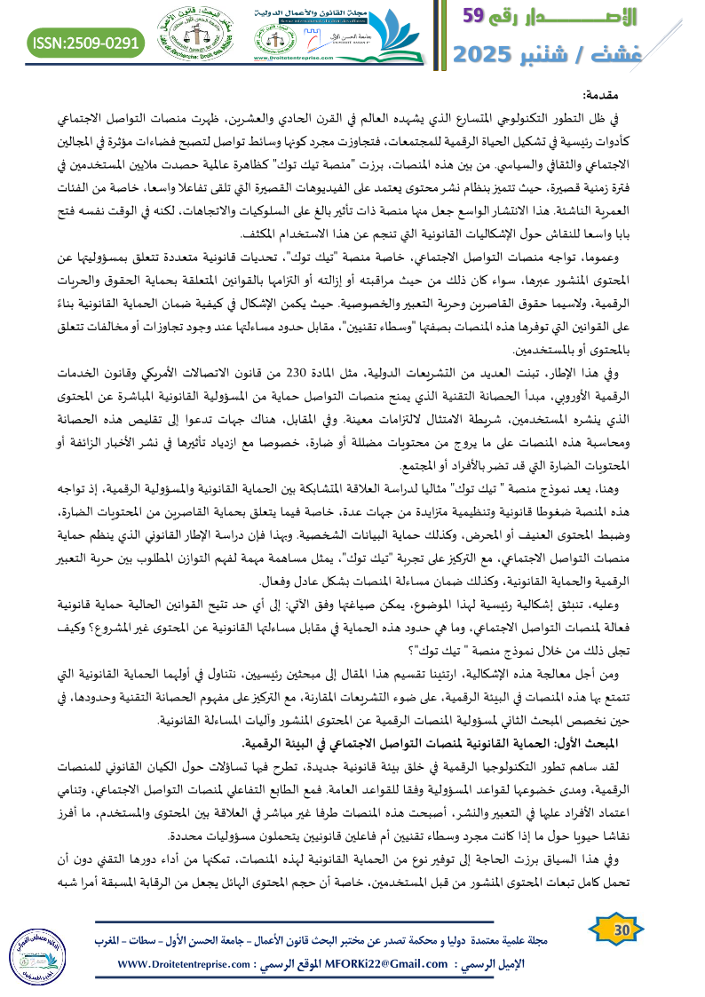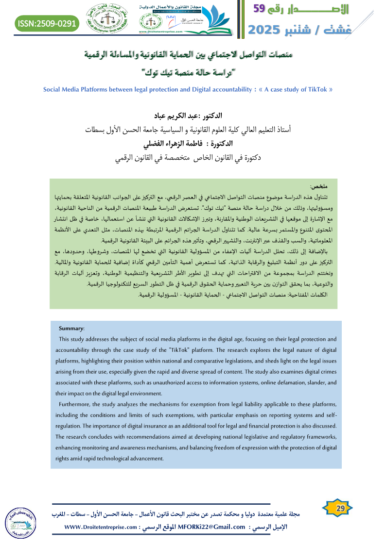منصات التواصل الاجتماعي بين الحماية القانونية والمساءلة الرقمية “دراسة حالة منصة تيك توك” الدكتور :عبد الكريم عباد الدكتورة : فاطمة الزهراء الفضلي