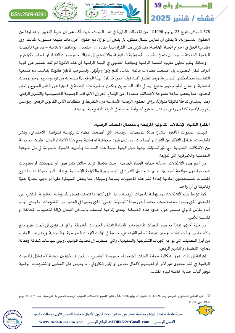 وفي سياق مقارن، نجد أن التشريع الفرنسي قد أولى أهمية كبيرة لمسألة حماية الحياة الخاصة في البيئة الرقمية، خاصة مع تنامي دور المنصات الإلكترونية كوسائط لنشر المعلومات والتعبير عن الآراء. ويعتبر قرار المجلس الدستوري الفرنسي رقم 378 الصادر بتاريخ 23 يولينو 1996[10] من المحطات البارزة في هذا الصدد، حيث أكد على أن حرية التعبير، باعتبارها من الحقوق الدستورية، لا يمكن أن تمارس بشكل مطلق، بل ينبغي أن توازن مع حقوق أخرى ذات طبيعة دستورية كذلك، وفي مقدمتها الحق في احترام الحياة الخاصة. وقد كرّس هذا القرار مبدأ مفاده أن استعمال الوسائط الإعلامية – بما فيها المنصات الرقمية الحديثة – يجب أن يتم في إطار من المسؤولية القانونية، وألا يُفضي إلى انتهاك خصوصيات الأفراد أو المساس بكرامتهم.