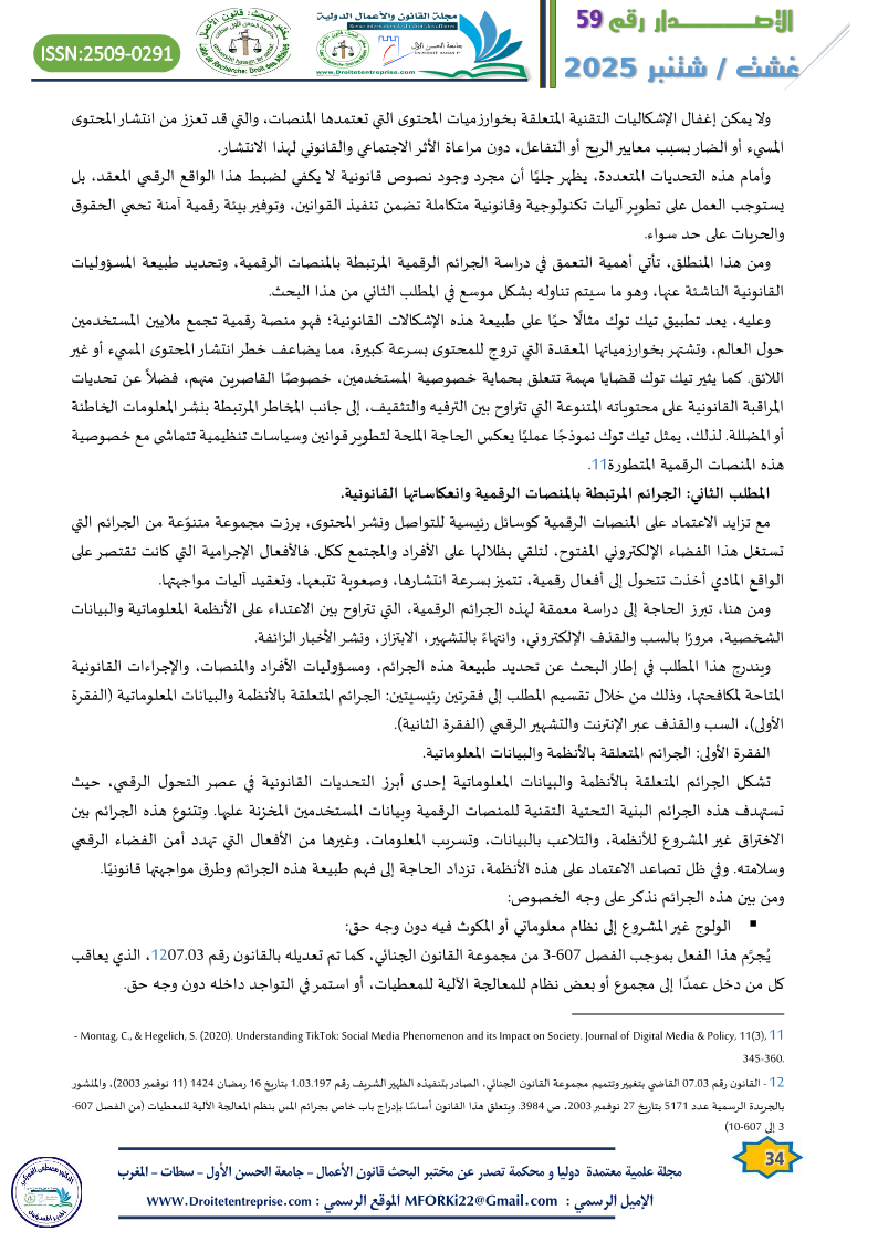 تتناول هذه الدراسة موضوع منصات التواصل الاجتماعي في العصر الرقمي، مع التركيز على الجوانب القانونية المتعلقة بحمايتها ومسؤوليتها، وذلك من خلال دراسة حالة منصة “تيك توك”. تستعرض الدراسة طبيعة المنصات الرقمية من الناحية القانونية، مع الإشارة إلى موقعها في التشريعات الوطنية والمقارنة، وتبرز الإشكالات القانونية التي تنشأ عن استعمالها، خاصة في ظل انتشار المحتوى المتنوع والمستمر بسرعة عالية. كما تتناول الدراسة الجرائم الرقمية المرتبطة بهذه المنصات، مثل التعدي على الأنظمة المعلوماتية، والسب والقذف عبر الإنترنت، والتشهير الرقمي، وتأثير هذه الجرائم على البيئة القانونية الرقمية.