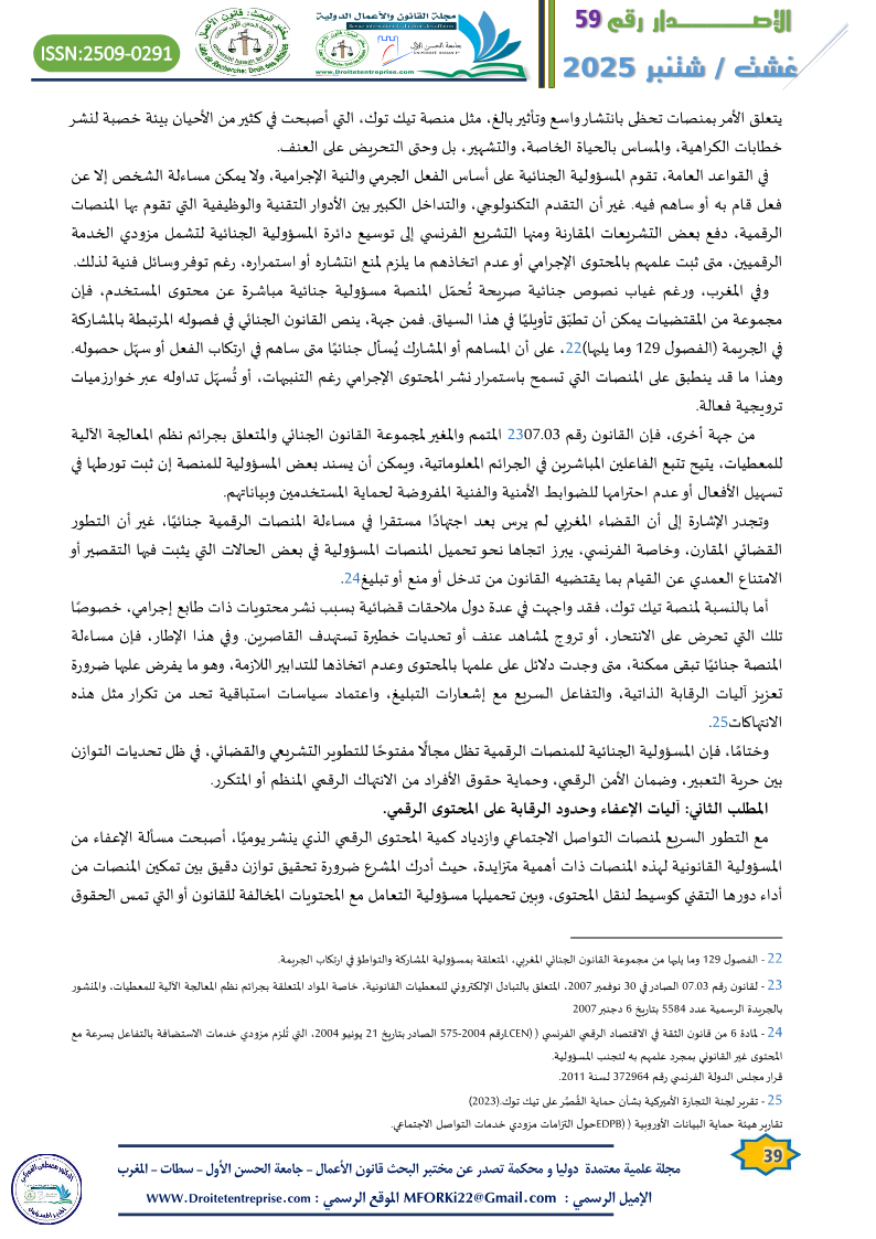 من جهة أخرى، فإن القانون رقم 07.03[23] المتمم والمغير لمجموعة القانون الجنائي والمتعلق بجرائم نظم المعالجة الآلية للمعطيات، يتيح تتبع الفاعلين المباشرين في الجرائم المعلوماتية، ويمكن أن يسند بعض المسؤولية للمنصة إن ثبت تورطها في تسهيل الأفعال أو عدم احترامها للضوابط الأمنية والفنية المفروضة لحماية المستخدمين وبياناتهم.