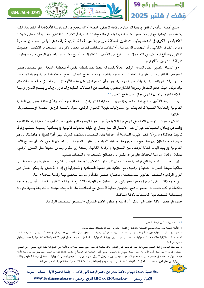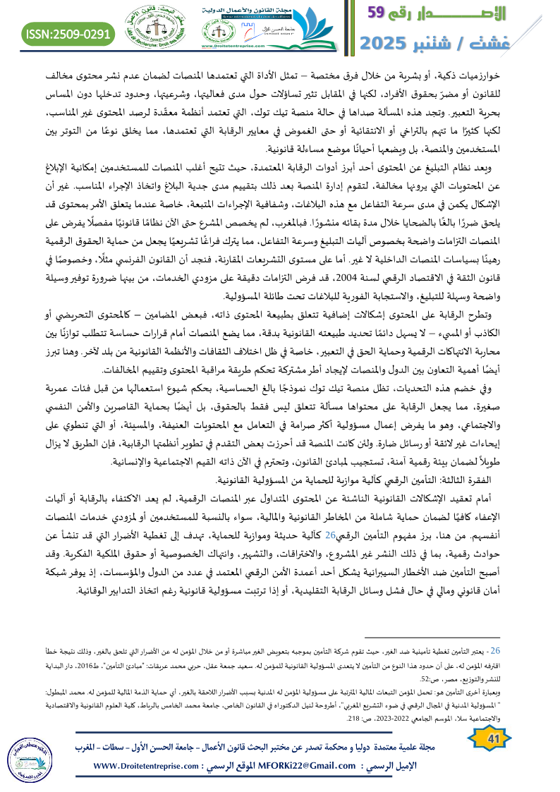 وفي السياق المغربي، يظل التأمين الرقمي مجالًا ناشئًا لم يحظ بعد بتنظيم دقيق أو بتغطية واسعة، رغم تنصيص بعض النصوص القانونية على ضرورة اتخاذ تدابير أمنية وتقنية، وهو ما يفتح المجال لتطوير منظومة تأمينية رقمية تستوعب خصوصيات الجرائم الرقمية والمخاطر السيبرانية. ويبدو أن الحاجة إلى مثل هذه الآلية تزداد إلحاحًا في حالة منصات مثل تيك توك، حيث حجم التفاعل وسرعة انتشار المحتوى يضاعف من احتمالات التبليغ والدعاوى، وبالتالي يصبح التأمين وسيلة عقلانية لضمان توازن قانوني ومالي عند وقوع الأضرار.[27]