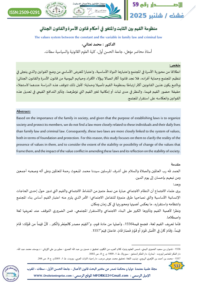 منظومة القيم بين الثابت والمتغير في أحكام قانون الأسرة والقانون الجنائي الدكتور : محمد نعناني،