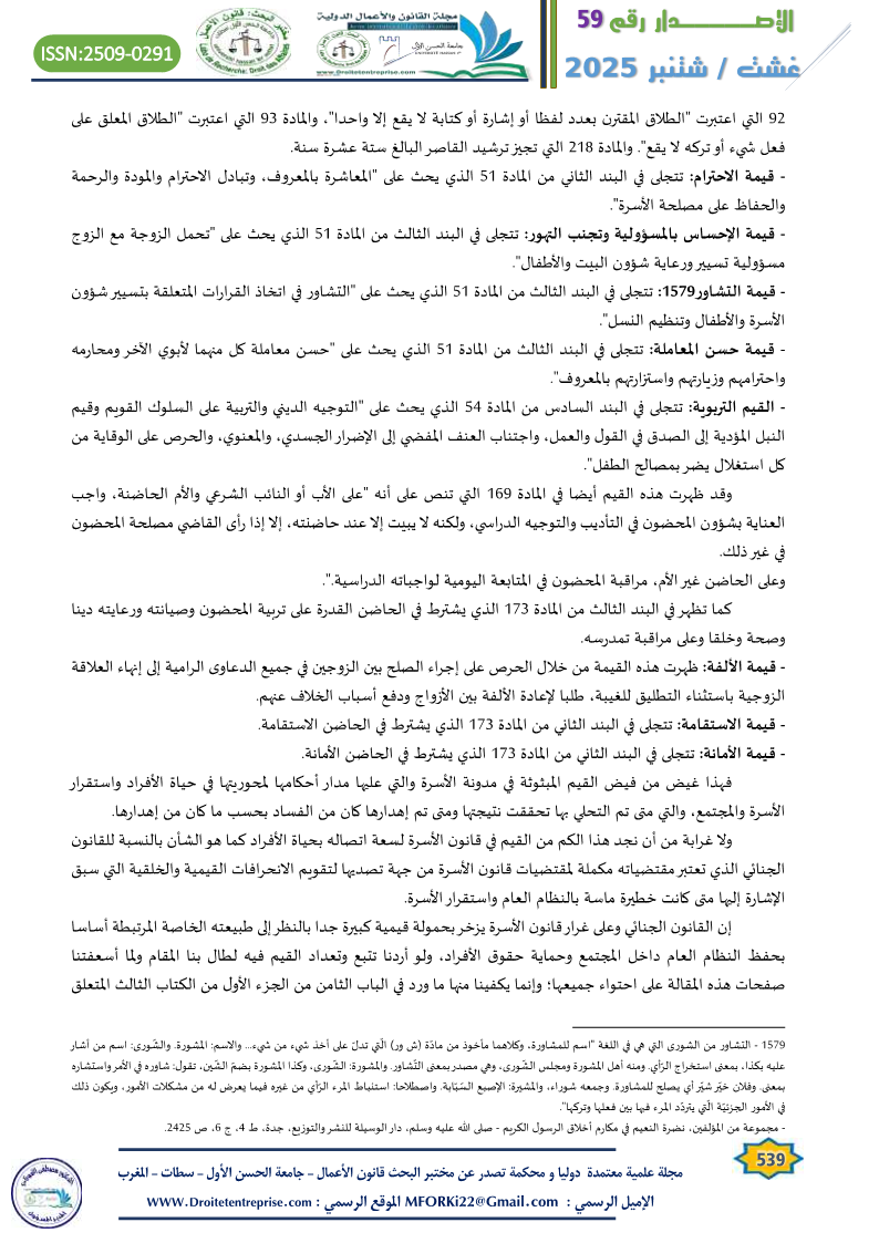 فهذا غيض من فيض القيم المبثوثة في مدونة الأسرة والتي عليها مدار أحكامها لمحوريتها في حياة الأفراد واستقرار الأسرة والمجتمع، والتي متى تم التحلي بها تحققت نتيجتها ومتى تم إهدارها كان من الفساد بحسب ما كان من إهدارها.
