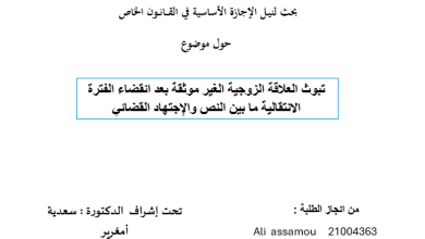 بحث لنيـل الإجازة الأساسية في القـــانــون الخاص حول موضوع تبوث العلاقة الزوجية الغير موثقة بعد انقضاء الفترة الانتقالية ما بين…