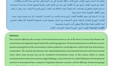 الإرهاب البيئي: بين التحديات القانونية وآليات المواجهة “Environmental Terrorism: Between Legal Challenges and Mechanisms for Confrontation” الدكتورة :…