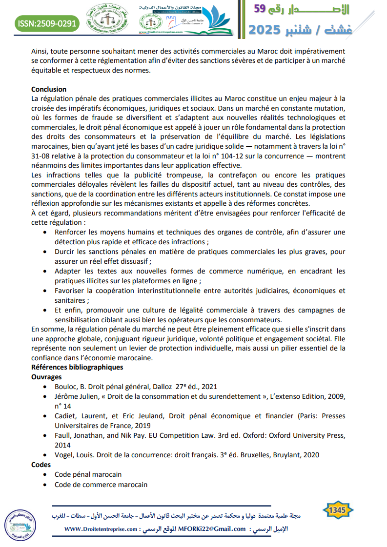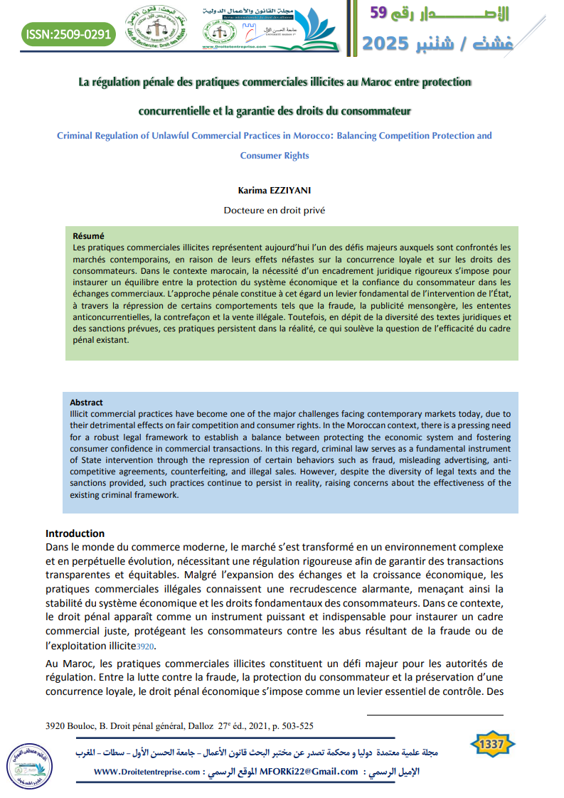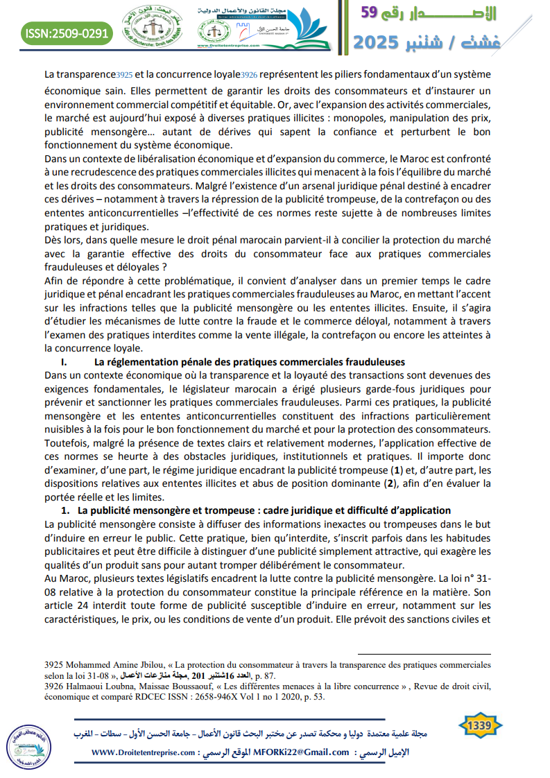 Les pratiques commerciales illicites représentent aujourd’hui l’un des défis majeurs auxquels sont confrontés les marchés contemporains, en raison de leurs effets néfastes sur la concurrence loyale et sur les droits des consommateurs. Dans le contexte marocain, la nécessité d’un encadrement juridique rigoureux s’impose pour instaurer un équilibre entre la protection du système économique et la confiance du consommateur dans les échanges commerciaux. L’approche pénale constitue à cet égard un levier fondamental de l’intervention de l’État, à travers la répression de certains comportements tels que la fraude, la publicité mensongère, les ententes anticoncurrentielles, la contrefaçon et la vente illégale. Toutefois, en dépit de la diversité des textes juridiques et des sanctions prévues, ces pratiques persistent dans la réalité, ce qui soulève la question de l’efficacité du cadre pénal existant.