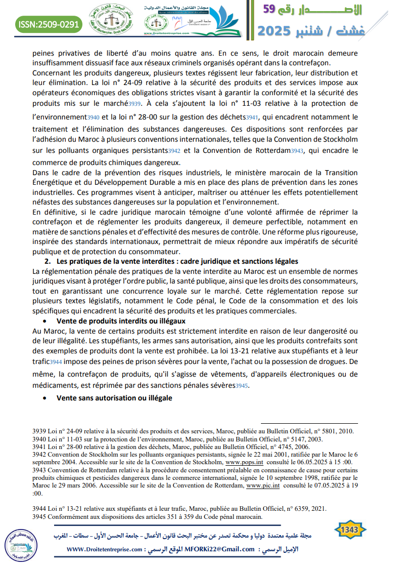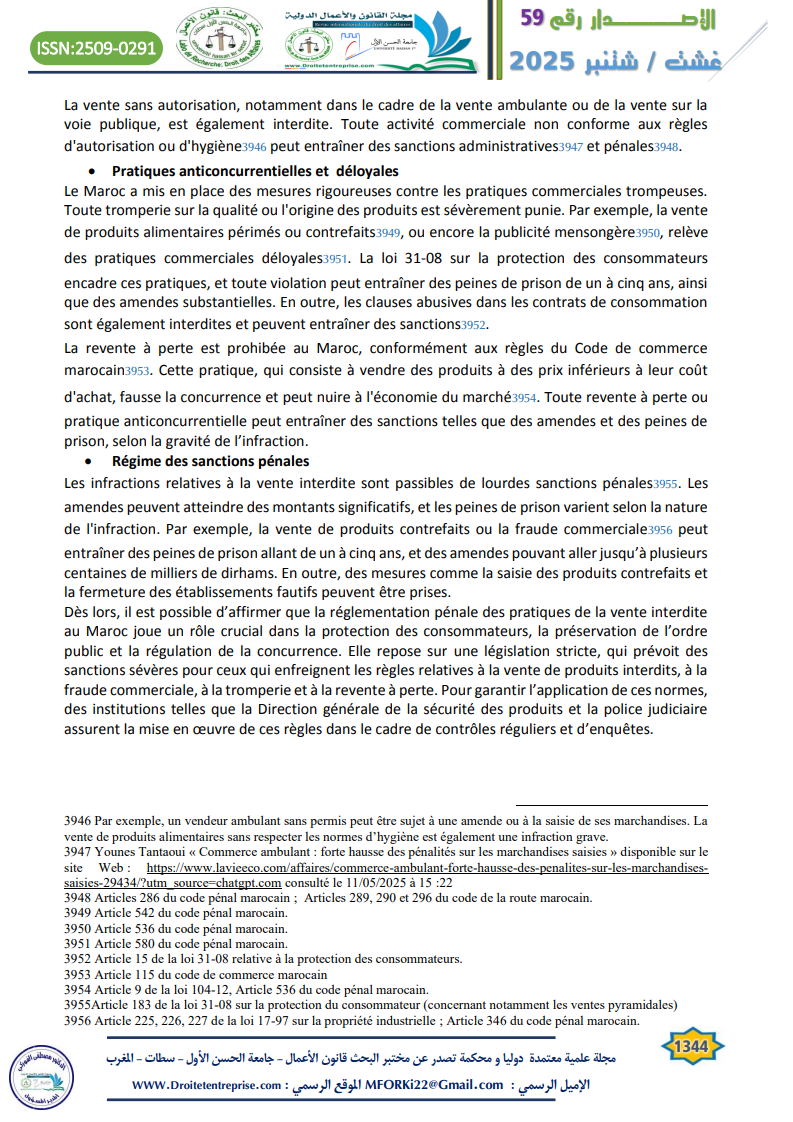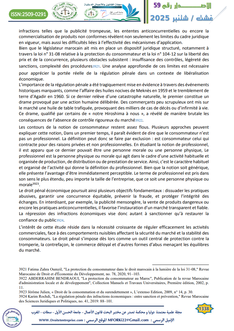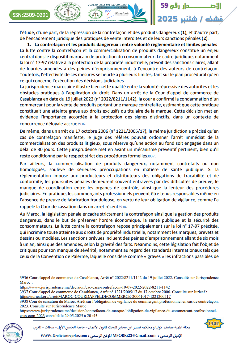 Les pratiques commerciales illicites représentent aujourd’hui l’un des défis majeurs auxquels sont confrontés les marchés contemporains, en raison de leurs effets néfastes sur la concurrence loyale et sur les droits des consommateurs. Dans le contexte marocain, la nécessité d’un encadrement juridique rigoureux s’impose pour instaurer un équilibre entre la protection du système économique et la confiance du consommateur dans les échanges commerciaux. L’approche pénale constitue à cet égard un levier fondamental de l’intervention de l’État, à travers la répression de certains comportements tels que la fraude, la publicité mensongère, les ententes anticoncurrentielles, la contrefaçon et la vente illégale. Toutefois, en dépit de la diversité des textes juridiques et des sanctions prévues, ces pratiques persistent dans la réalité, ce qui soulève la question de l’efficacité du cadre pénal existant.