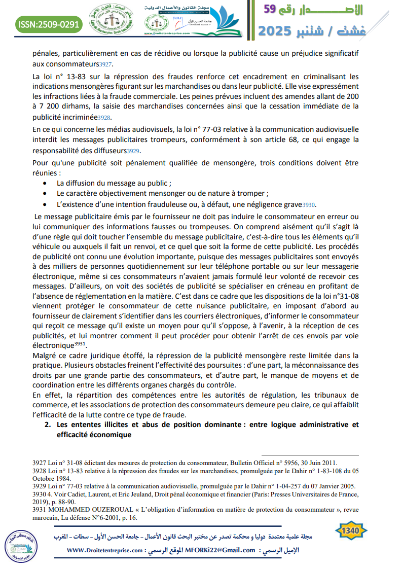 Dans un contexte économique où la transparence et la loyauté des transactions sont devenues des exigences fondamentales, le législateur marocain a érigé plusieurs garde-fous juridiques pour prévenir et sanctionner les pratiques commerciales frauduleuses. Parmi ces pratiques, la publicité mensongère et les ententes anticoncurrentielles constituent des infractions particulièrement nuisibles à la fois pour le bon fonctionnement du marché et pour la protection des consommateurs. Toutefois, malgré la présence de textes clairs et relativement modernes, l’application effective de ces normes se heurte à des obstacles juridiques, institutionnels et pratiques. Il importe donc d’examiner, d’une part, le régime juridique encadrant la publicité trompeuse (1) et, d’autre part, les dispositions relatives aux ententes illicites et abus de position dominante (2), afin d’en évaluer la portée réelle et les limites.