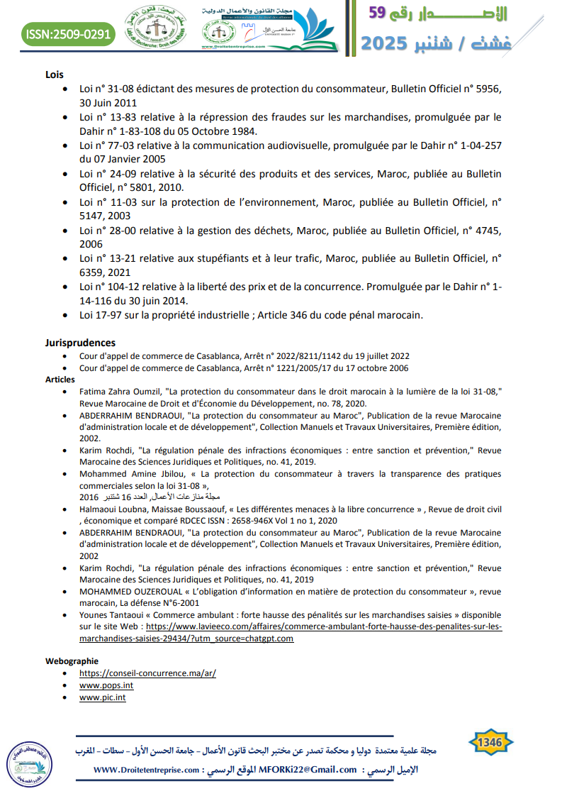 - Fatima Zahra Oumzil, “La protection du consommateur dans le droit marocain à la lumière de la loi 31-08,” Revue Marocaine de Droit et d’Économie du Développement, no. 78, 2020.