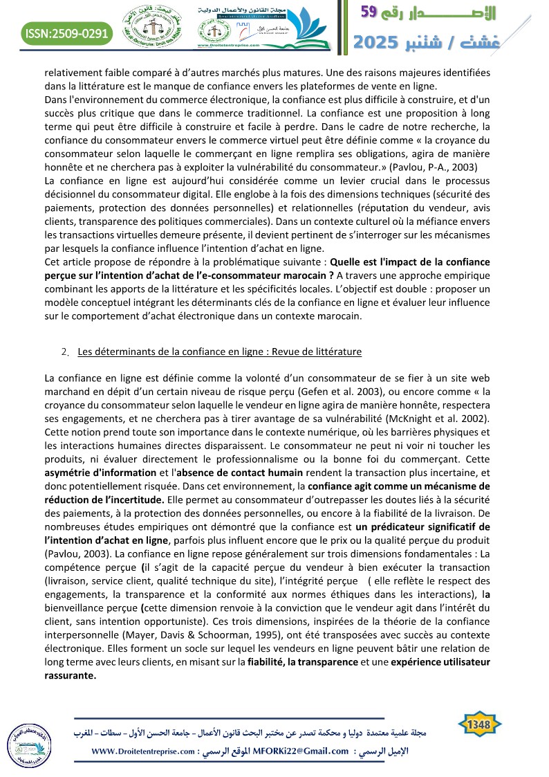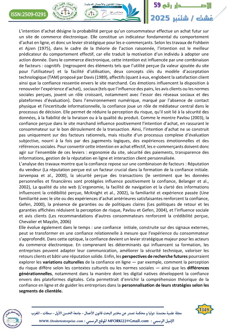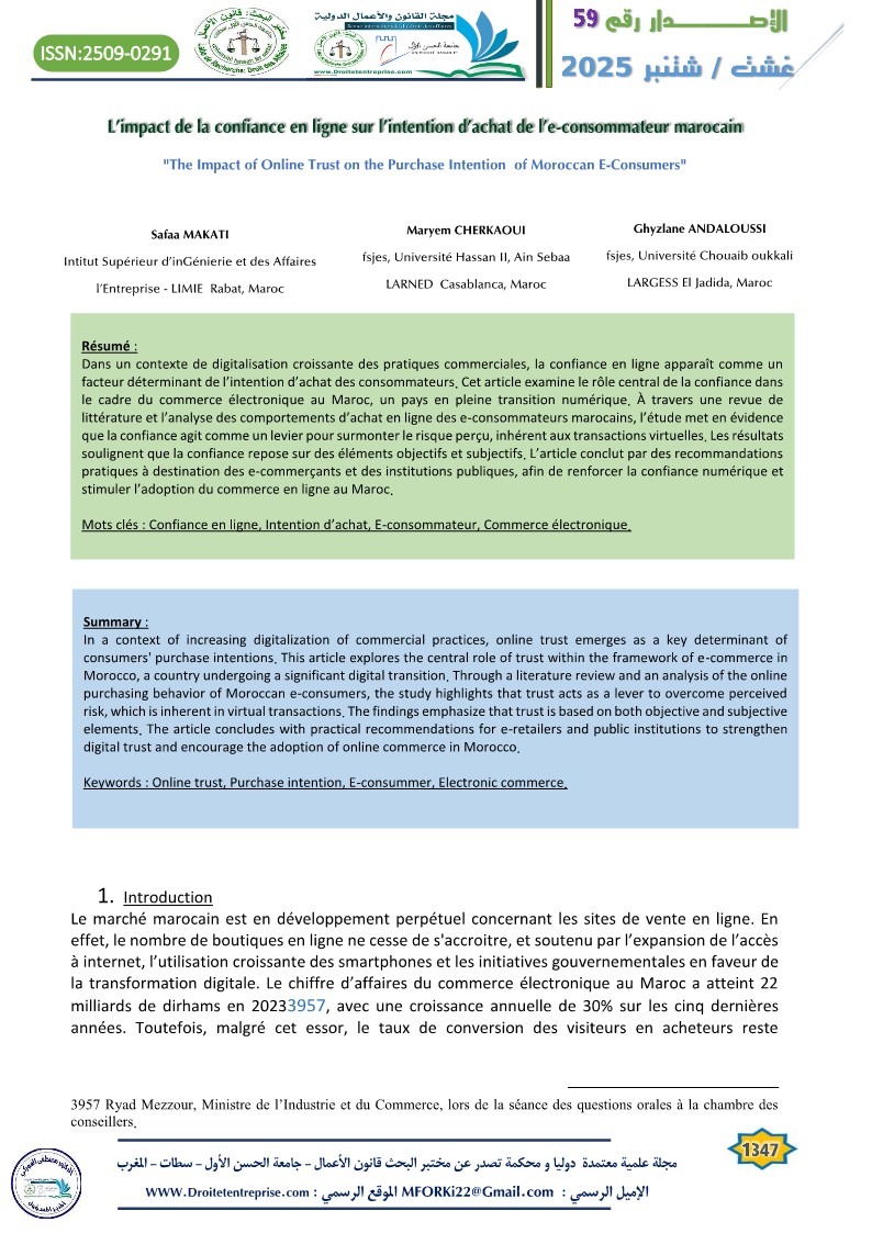 In a context of increasing digitalization of commercial practices, online trust emerges as a key determinant of consumers’ purchase intentions. This article explores the central role of trust within the framework of e-commerce in Morocco, a country undergoing a significant digital transition. Through a literature review and an analysis of the online purchasing behavior of Moroccan e-consumers, the study highlights that trust acts as a lever to overcome perceived risk, which is inherent in virtual transactions. The findings emphasize that trust is based on both objective and subjective elements. The article concludes with practical recommendations for e-retailers and public institutions to strengthen digital trust and encourage the adoption of online commerce in Morocco.