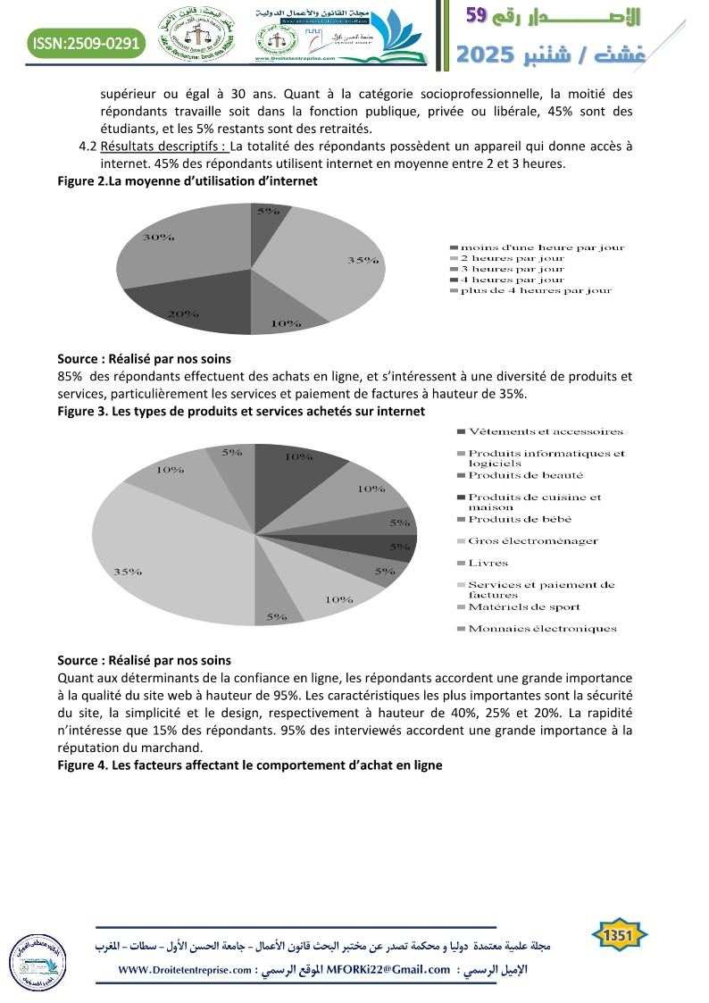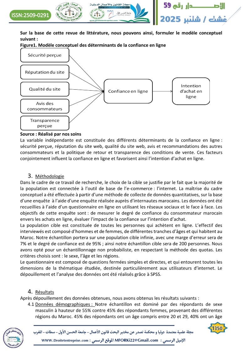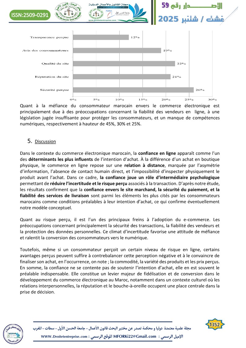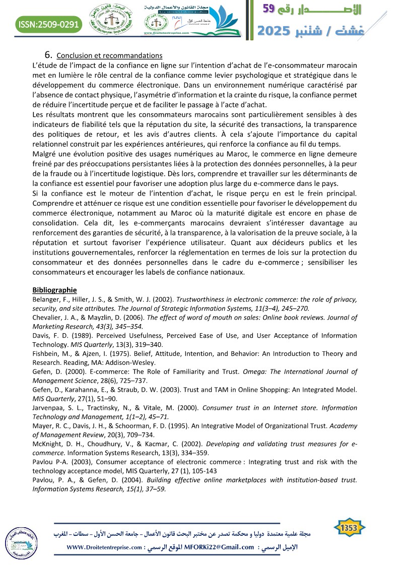 In a context of increasing digitalization of commercial practices, online trust emerges as a key determinant of consumers’ purchase intentions. This article explores the central role of trust within the framework of e-commerce in Morocco, a country undergoing a significant digital transition. Through a literature review and an analysis of the online purchasing behavior of Moroccan e-consumers, the study highlights that trust acts as a lever to overcome perceived risk, which is inherent in virtual transactions. The findings emphasize that trust is based on both objective and subjective elements. The article concludes with practical recommendations for e-retailers and public institutions to strengthen digital trust and encourage the adoption of online commerce in Morocco.